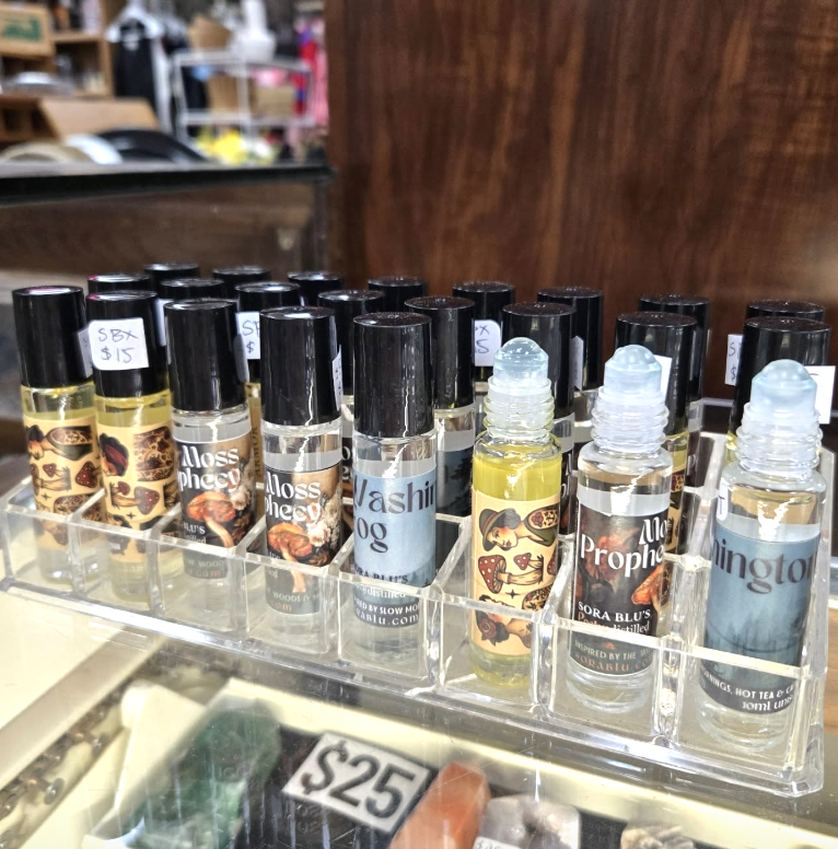 Sora is one of our newer vendors, a local herbalist and photographer who offers handmade essential oil perfumes alongside a curated collection of crystals and minerals from around the world. Her ever-rotating selection is sure to brighten any rockhound’s day. Sora also brings her creative eye to Yakima Finds as part of our marketing and social media crew.